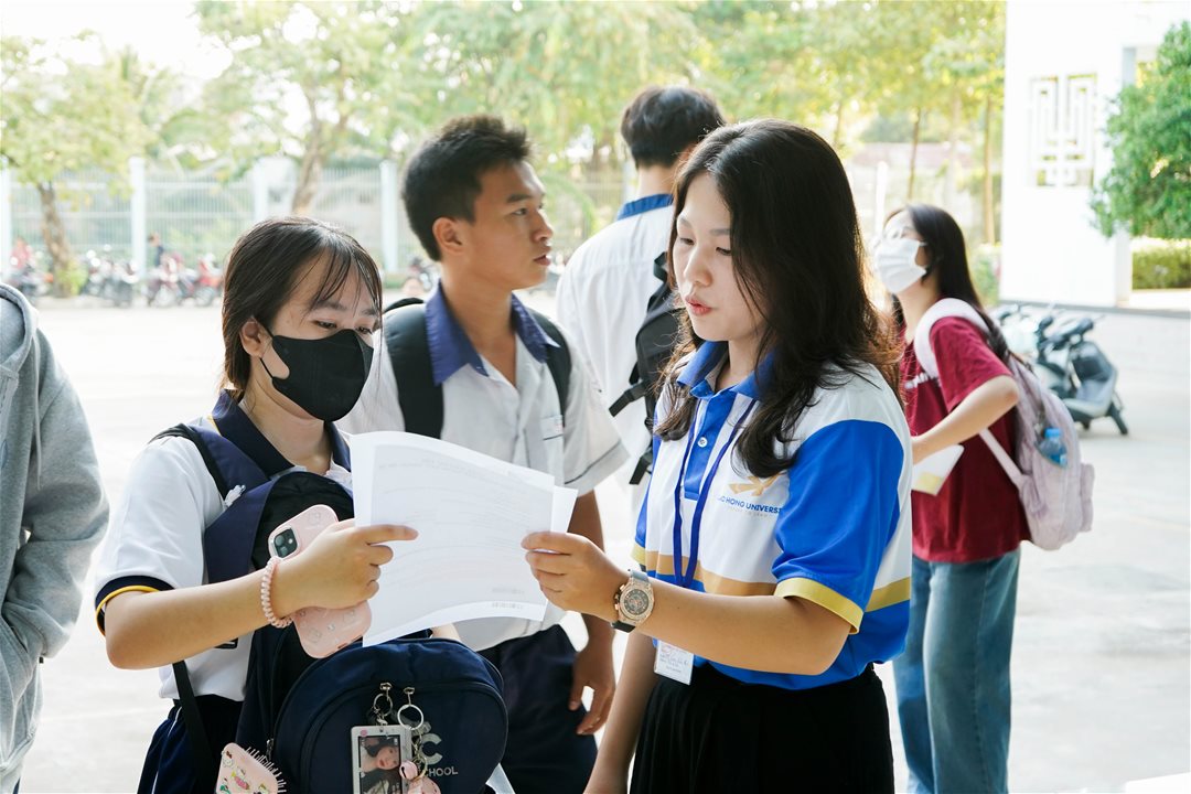 Đội ngũ tình nguyện viên LHU hỗ trợ và giải thích các thông tin cho thí sinh tại điểm thi