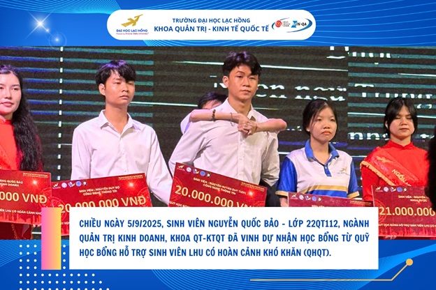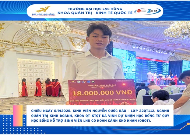 Với những nỗ lực không ngừng trong học tập và rèn luyện, mới đây, chiều ngày 5/9/2025 tại The Mira Central Park, Bảo đã vinh dự nhận được học bổng từ Quỹ học bổng hỗ trợ sinh viên LHU có hoàn cảnh khó khăn (QHQT). Đây không chỉ là phần thưởng xứng đáng cho tinh thần cầu tiến của em, mà còn là nguồn động viên lớn lao để Bảo tiếp tục chinh phục ước mơ.