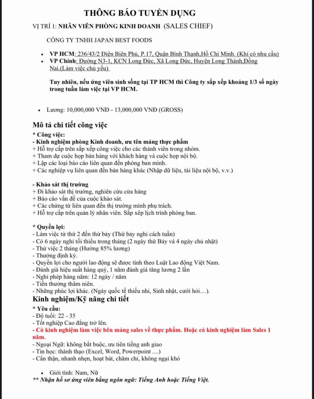 Công Ty TNHH JAPAN BEST FOODS thông báo tuyển dụng nhân viên ngành Công nghệ thực phẩm