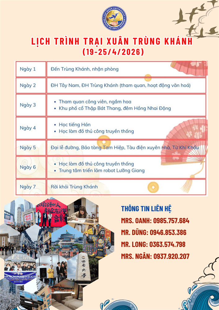- 👉Thông tin chi tiết vui lòng liên hệ: Phòng Quan hệ Quốc tế - C104, Cơ sở 1, trường ĐH Lạc Hồng.