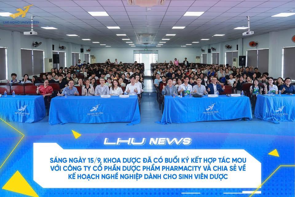 Sáng ngày 15/9/2025, tại Trường Đại học Lạc Hồng (LHU), Khoa Dược đã phối hợp cùng Công ty Cổ phần Dược phẩm Pharmacity long trọng tổ chức Lễ ký kết biên bản ghi nhớ (MOU) và chuỗi workshop “Định hướng phát triển nghề nghiệp” dành cho sinh viên.