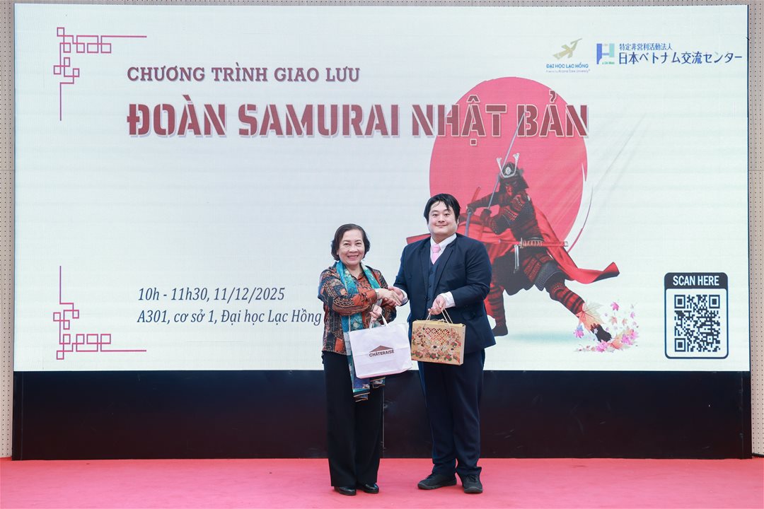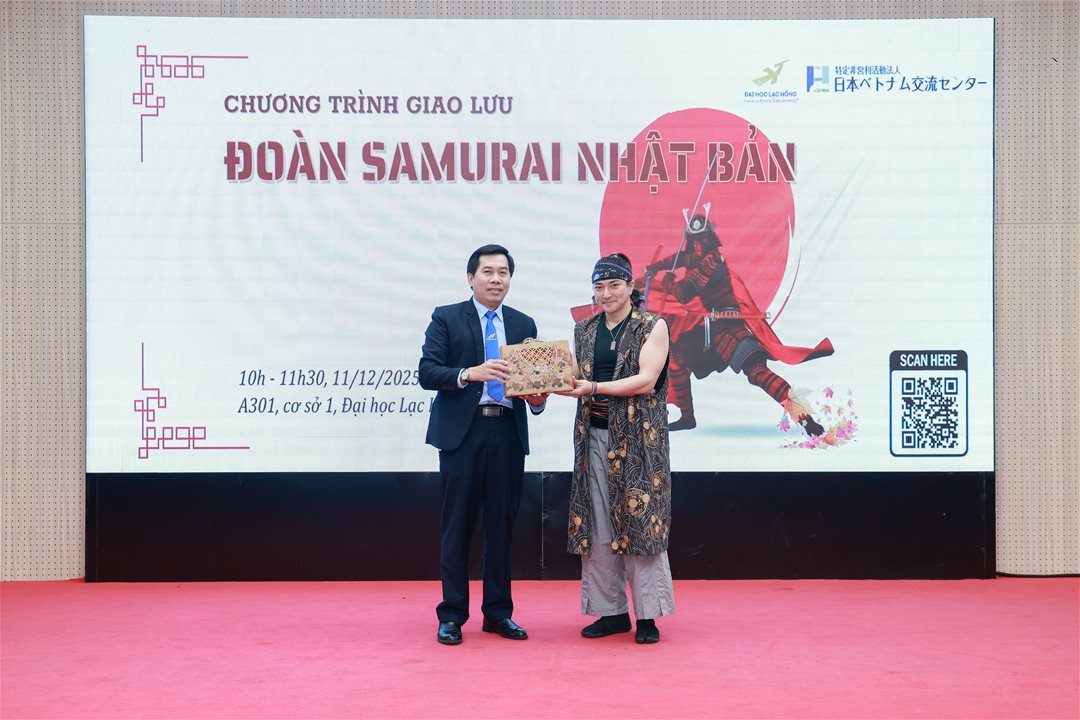 Sáng ngày 11/12/2025, Trường Đại học Lạc Hồng phối hợp cùng Trung tâm Giao lưu Việt – Nhật long trọng tổ chức chương trình giao lưu văn hoá với Đoàn Samurai Nhật Bản – SAMURAIGANG tại phòng A301, cơ sở 1. Buổi giao lưu có sự hiện diện của ông Sho Shiratori và ông Nguyễn Minh Tuấn, cùng các nghệ sĩ Samurai thuộc đoàn SAMURAIGANG. Về phía Nhà trường, chương trình vinh dự đón tiếp NGƯT. TS. Nguyễn Thị Thu Lan – Phó Hiệu trưởng, TS. Nguyễn Hữu Nghị – Trưởng Khoa Đông Phương học, ThS. Nguyễn Thị Như Thường – Phó Trưởng khoa Đông Phương học, ThS. Trần Minh Thùy Dương – Trưởng ngành Nhật Bản học, cùng quý thầy cô giảng viên và sinh viên tham dự.