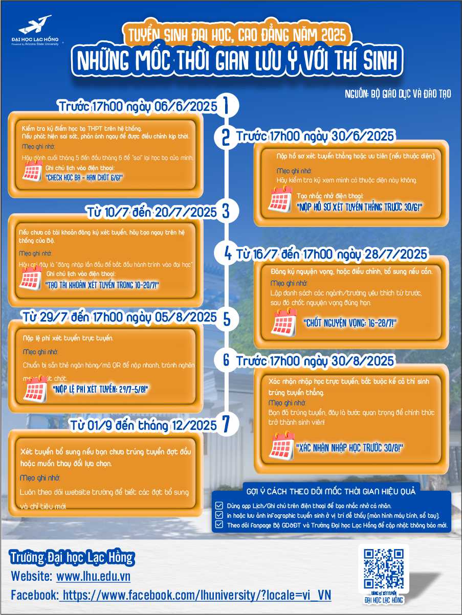 Mùa tuyển sinh 2025 đã bắt đầu, và để hành trình vào đại học diễn ra suôn sẻ, các bạn học sinh cần nắm vững 7 mốc thời gian quan trọng dưới đây. Đừng lo, Đại học Lạc Hồng sẽ hướng dẫn bạn cách ghi nhớ từng mốc một cách dễ dàng!