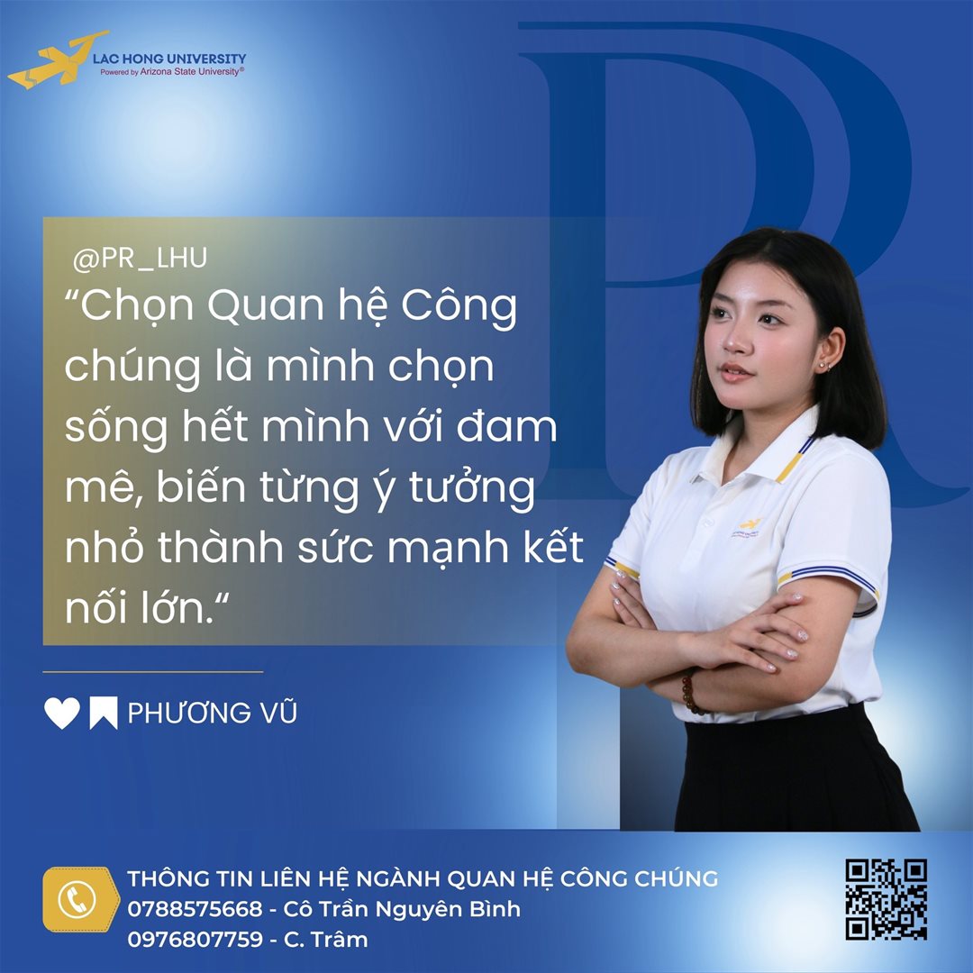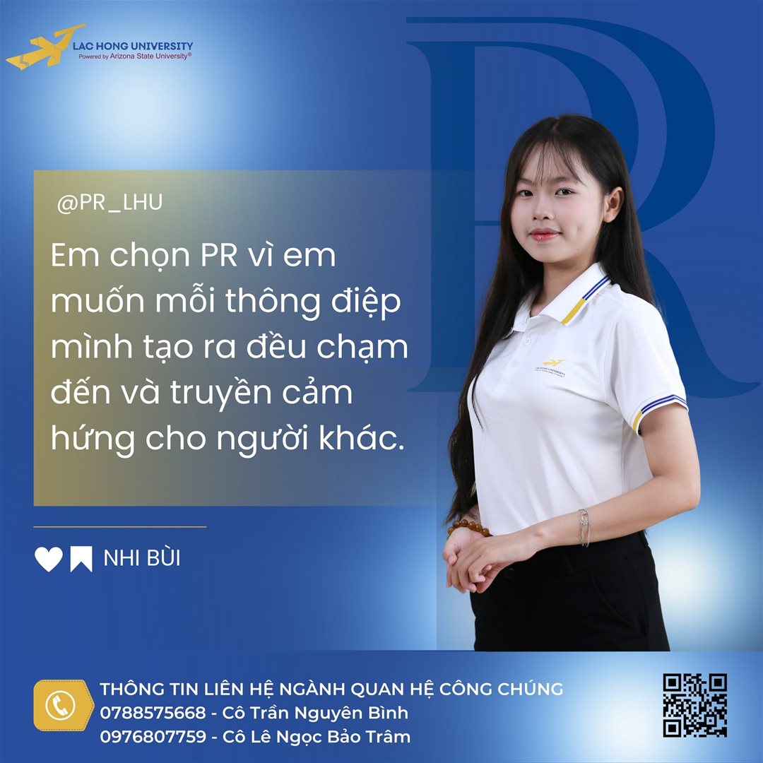 Em tin rằng học PR tại Đại học Lạc Hồng – với môi trường năng động, giảng viên nhiệt tình và chương trình học thực tiễn – sẽ giúp em phát huy hết tiềm năng của bản thân, đồng thời mở ra cơ hội để em trở thành người làm truyền thông có trách nhiệm, sáng tạo và giàu cảm hứng.”
